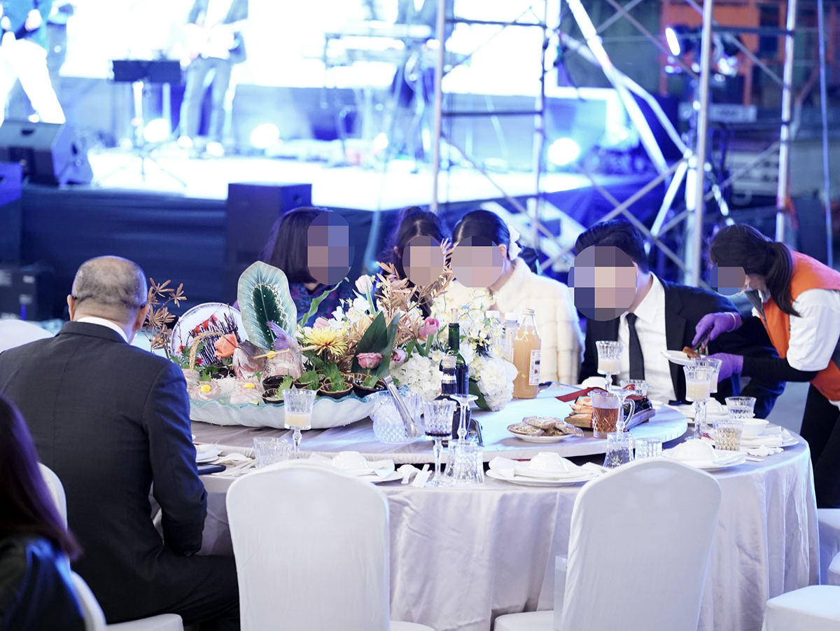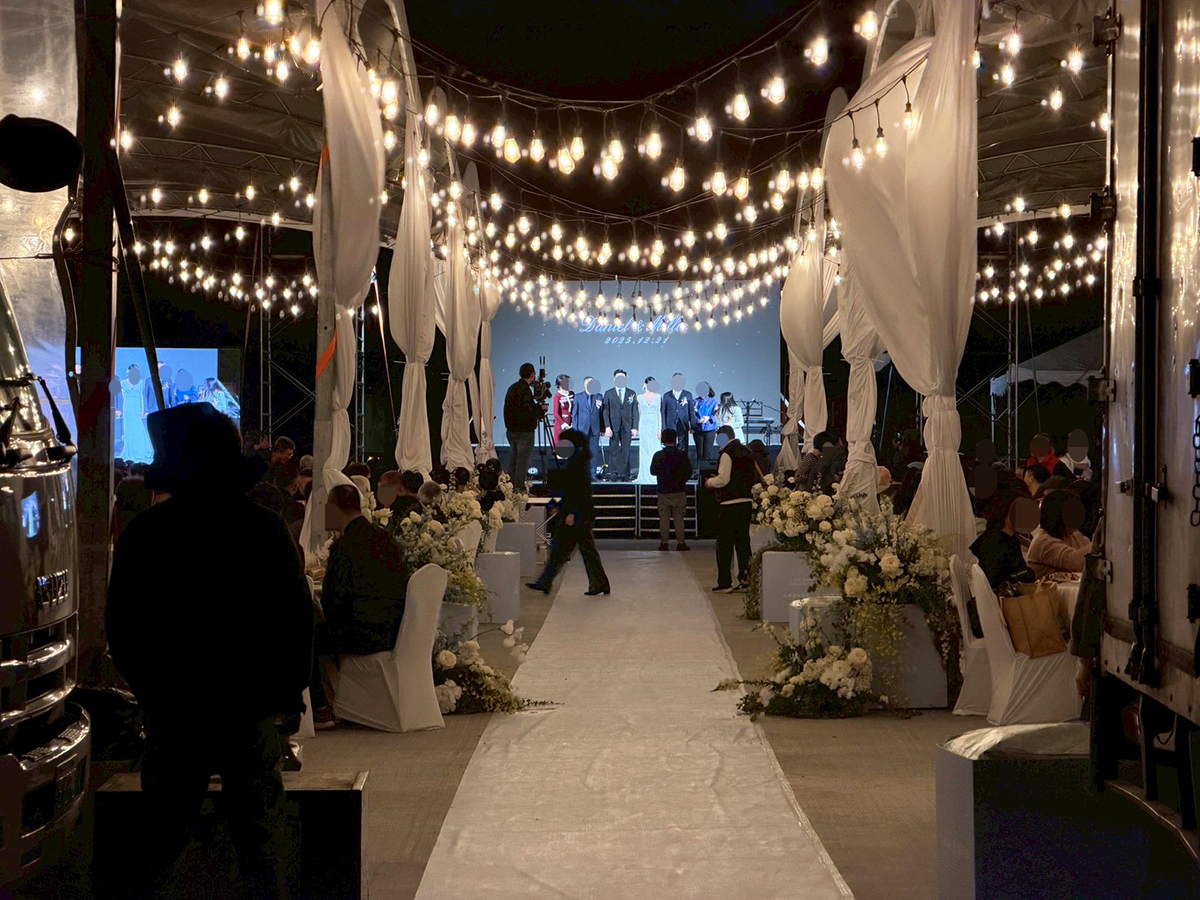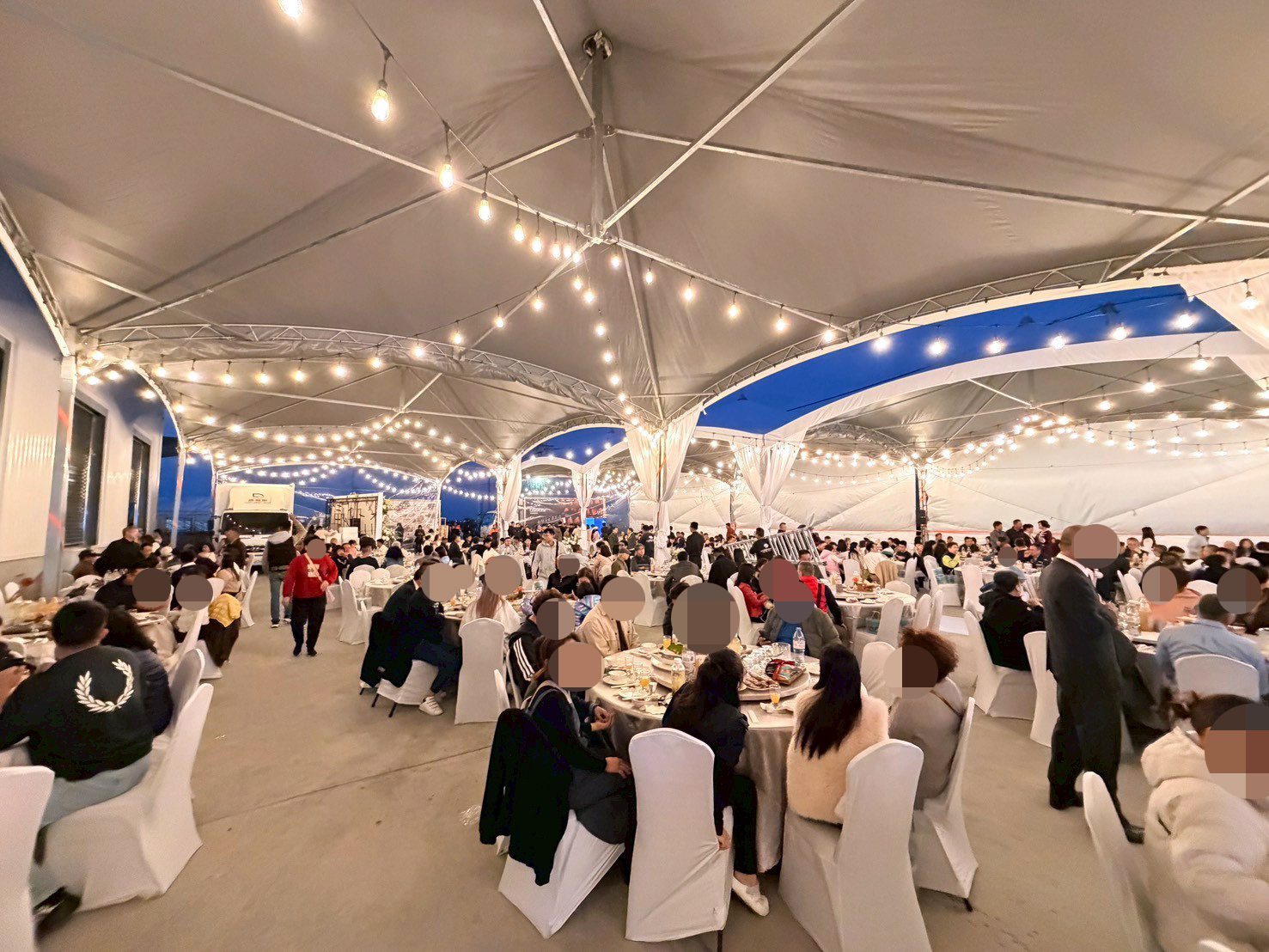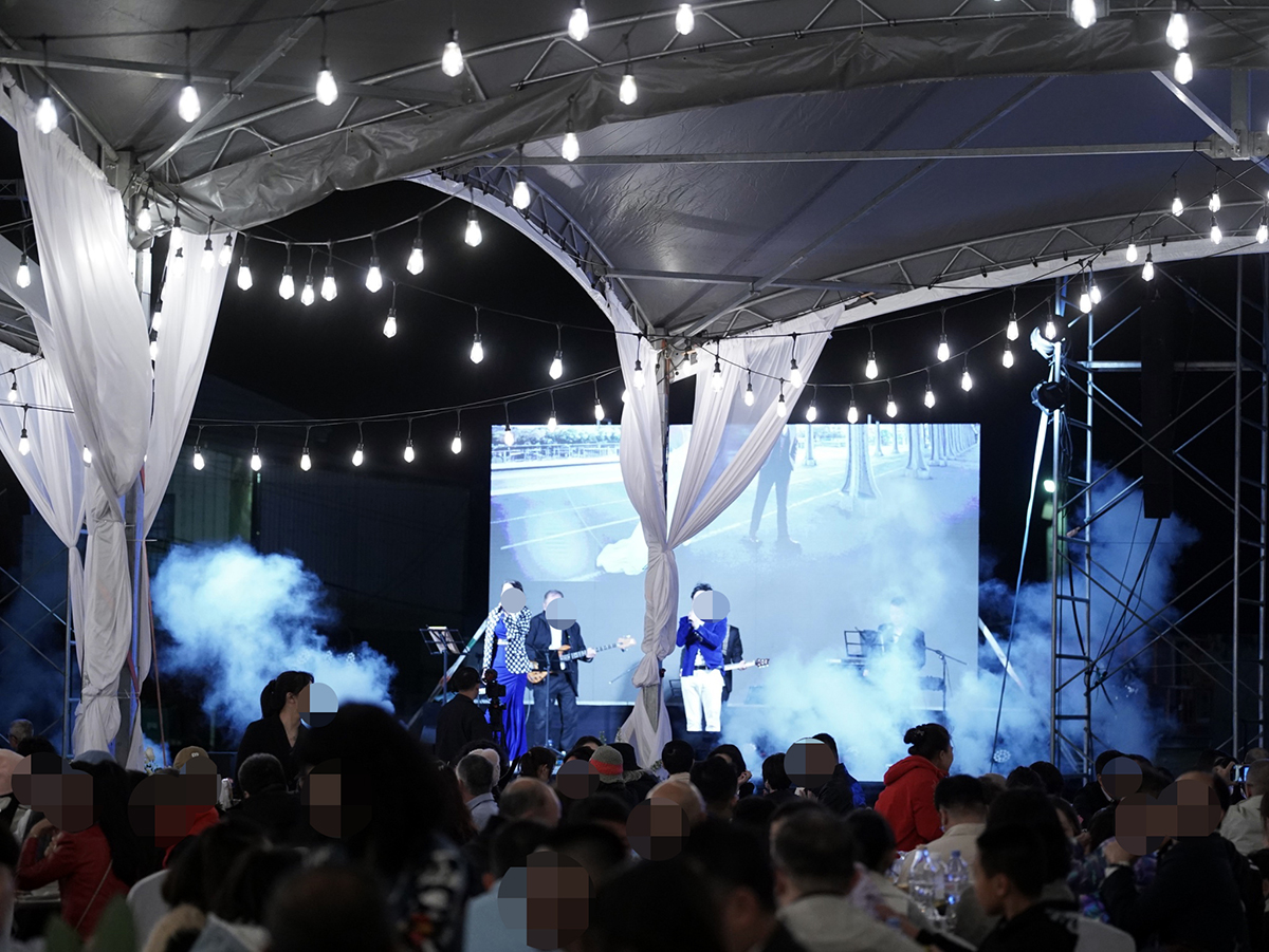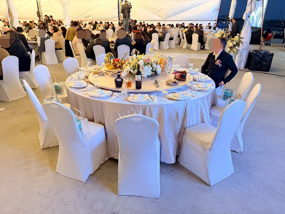 這場婚宴是戶外辦桌形式,一到現場就感覺很不一樣,燈光、桌椅、佈置都很到位,氣氛熱鬧又有質感。