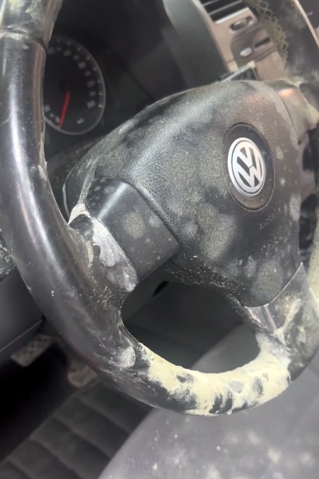 方向盤上幾乎要被霉菌包覆,像是被棉花糖包起來一樣(但一點都沒有棉花糖誘人!!)