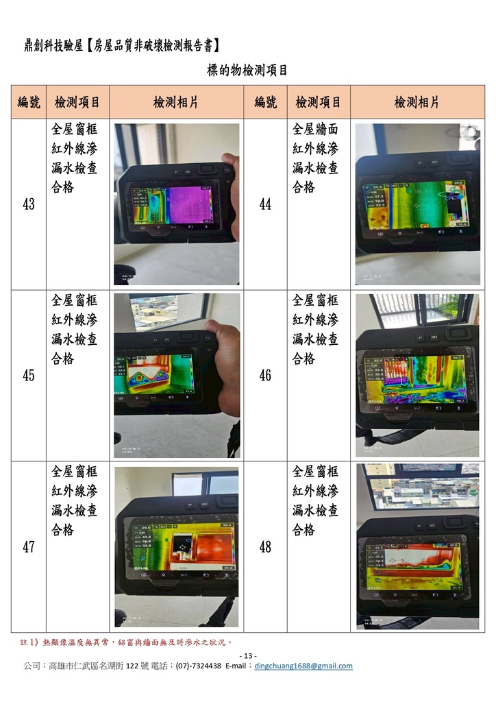鼎創最讓我放心的就是設備。他們用的檢測儀器加總價值破百萬,包含專業熱顯像儀、高階水平儀、內視鏡等,完全不是外面簡配公司能比。聽說有些業者甚至用測油溫的機器充數,準確度根本不能相比!!既然都花錢驗屋了,當然要找設備到位的。